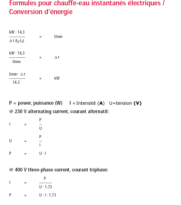 Formules mathématiques permettant de déterminer la puissance, le debit ou le Delta T d'un chauffe eau électrique instantané