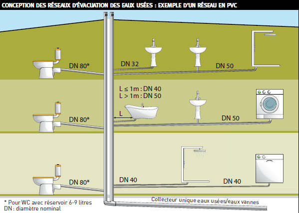 Le NF DTU 60.11 fait le point sur les règles techniques en termes de conception, pour la séparation des eaux usées et des eaux pluviales. Il rappelle que toutes les colonnes de chute doivent être prolongées en vertical jusqu'à l'air libre, dans le même diamètre, afin de laisser une entrée d'air et ventiler la colonne - ce qui permet d'éviter une dépression dans la colonne et le risque de siphonage des appareils sanitaires. Le texte précise également que si deux colonnes au minimum doivent être installées, il est en revanche possible d'avoir, soit un collecteur unique, soit des collecteurs séparés avant le raccordement à l'égout, avec des règles de dimensionnement différentes entre les deux systèmes. Le dimensionnement se faisant en fonction du taux de remplissage du collecteur, le NF DTU fournit deux tableaux distincts, l'un pour un débit récolté unique et l'autre pour des débits séparés. Deux points-clés sont donc à retenir dans ce nouveau texte. Le premier concerne la détermination des diamètres de conduite de chute, qui se fait désormais en fonction du débit admissible d'évacuation, et non plus en fonction du nombre d'appareils. Le second porte sur les règles de calcul pour les collecteurs en pied de chute, le débit admissible étant fonction de la pente, avec un minimum de 1 cm par mètre.